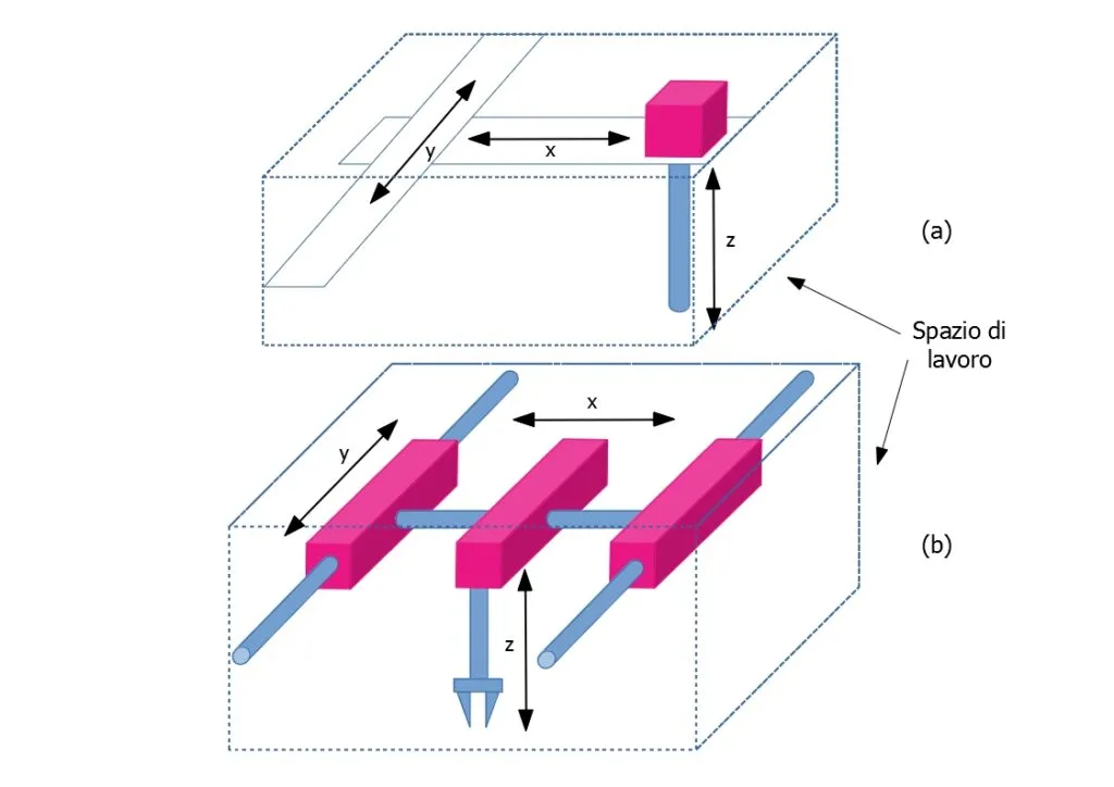 Lo schema (a) rappresenta il generico robot cartesiano, mentre lo schema (b) rappresenta il robot a portale, nel quale il componente orizzontale è supportato su entrambe le estremità.